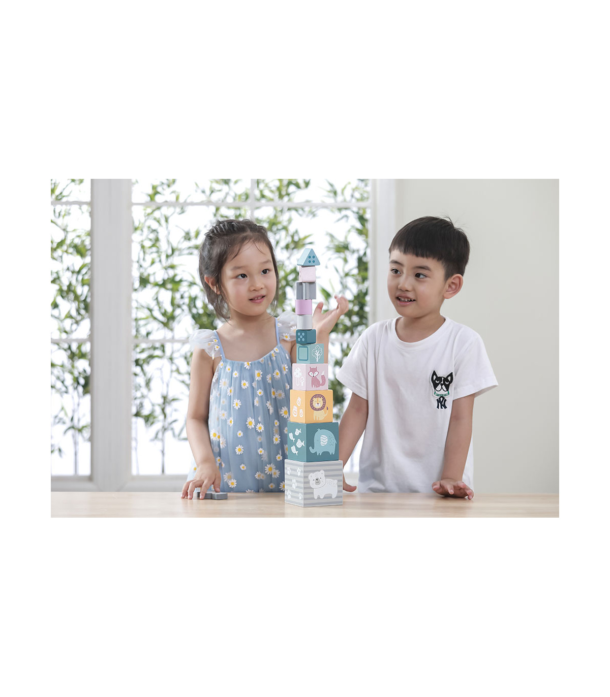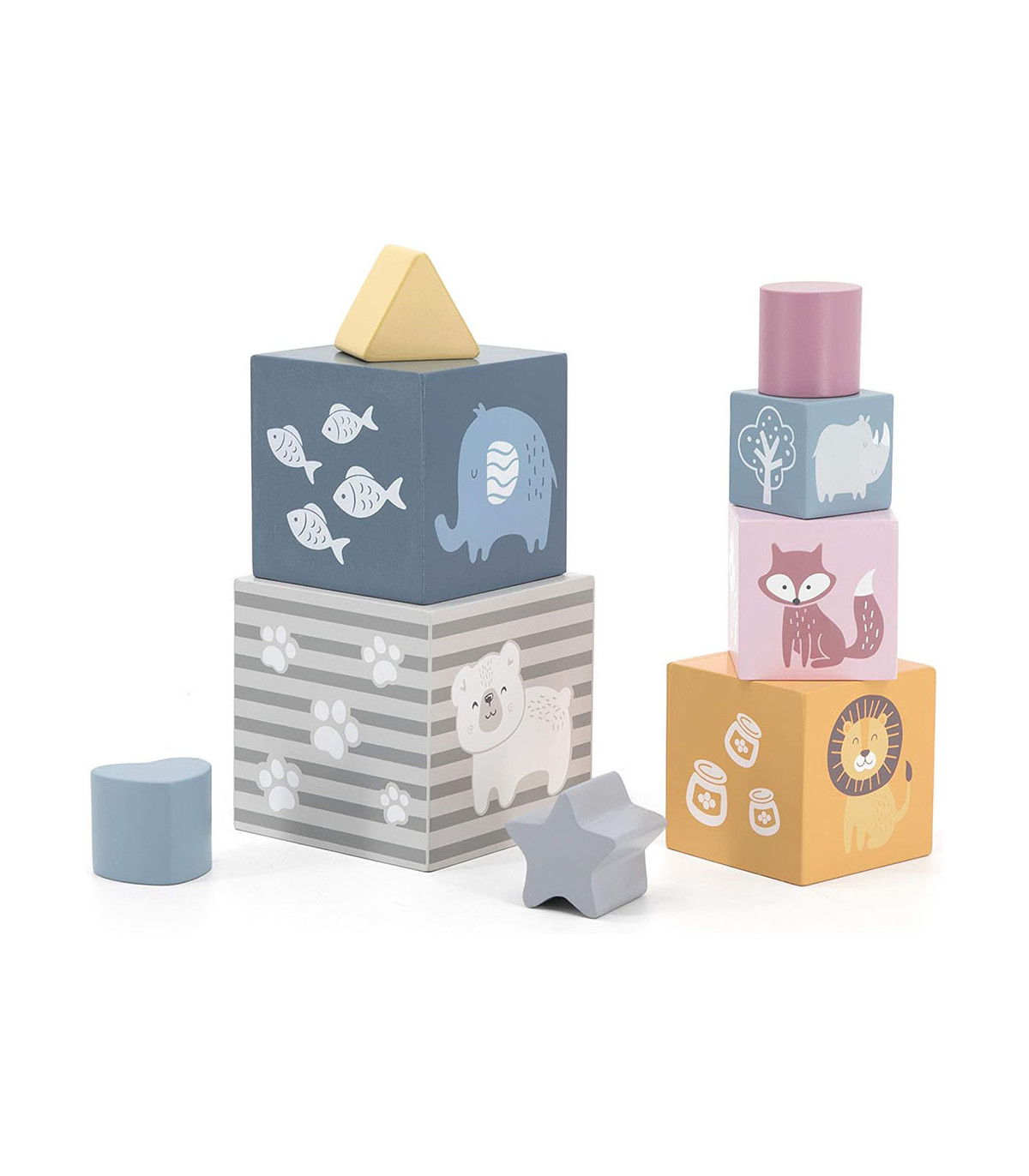 Este juego de bloques para apilar y encajar ofrece una experiencia divertida y formativa para los más pequeños. Incluye cinco cubos de distintos tamaños y orificios con formas geométricas, junto con cuatro bloques para clasificar. Los niños pueden apilar, encajar y ordenar las piezas mientras descubren números, figuras y diferentes animales. Es un juguete ideal para estimular la coordinación visual y motora, la memoria, el reconocimiento de formas y colores, así como la comprensión básica de los números y la concentración.